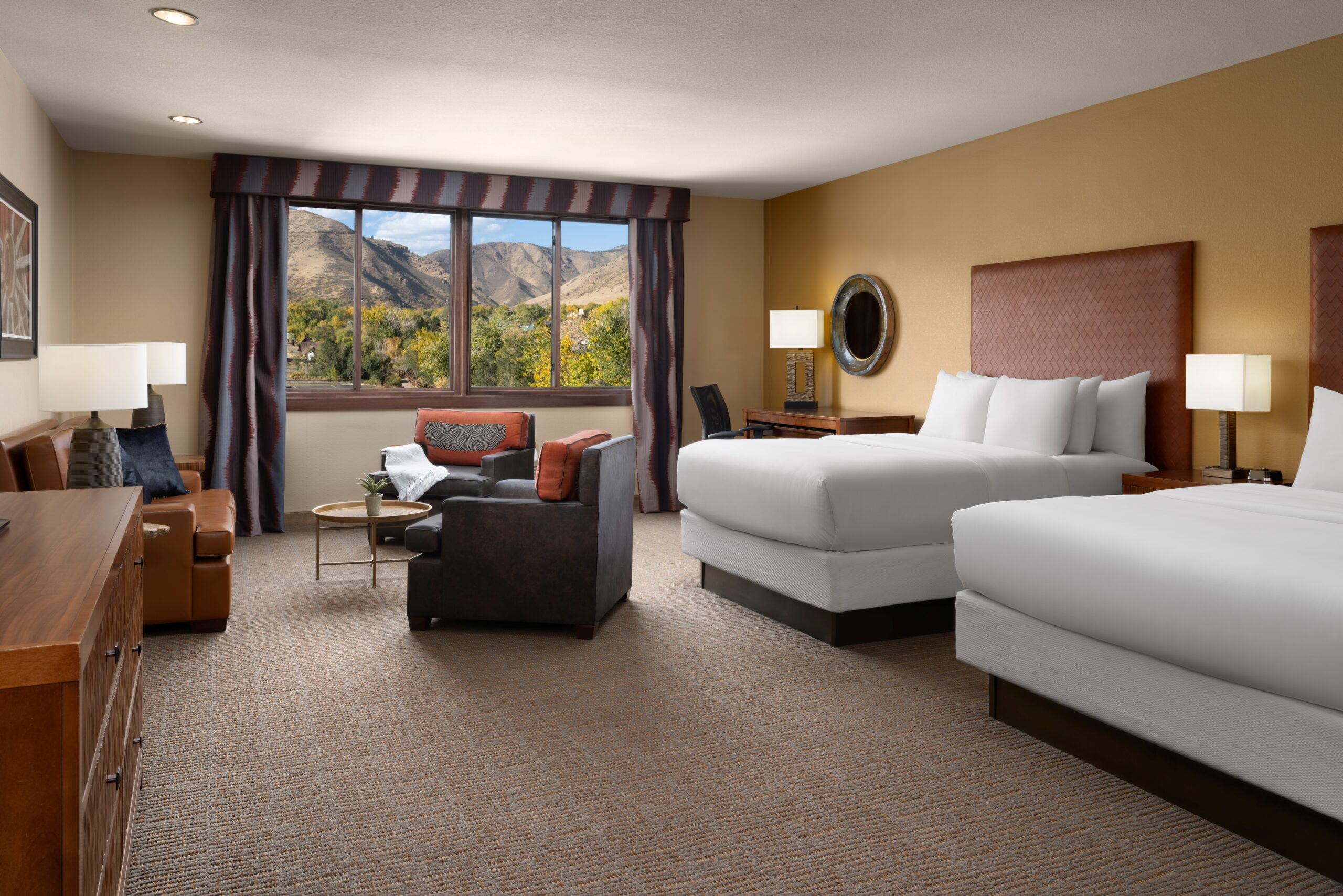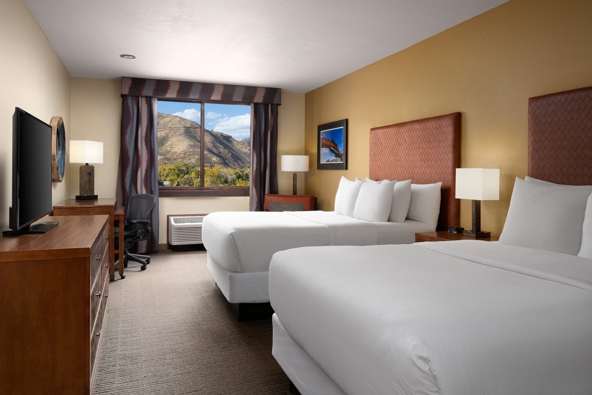 Comfortable well-appointed deluxe room with two queen beds. Free High Speed internet access, 50″ flat panel LCD television with HD programming, mini refrigerator and microwave, five-star bedding, plush robes and much more.